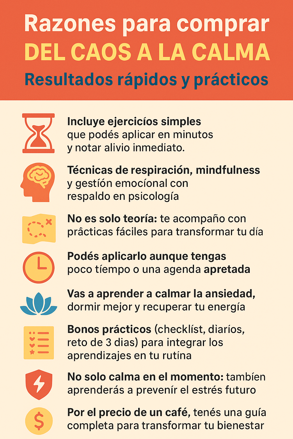 Para personas que sienten que el estrés y la ansiedad les pasan factura, que desean recuperar paz y claridad, “Del Caos a la Calma” ofrece un método práctico y cercano que transforma tu día a día en pasos simples, a diferencia de técnicas genéricas imposibles de sostener.