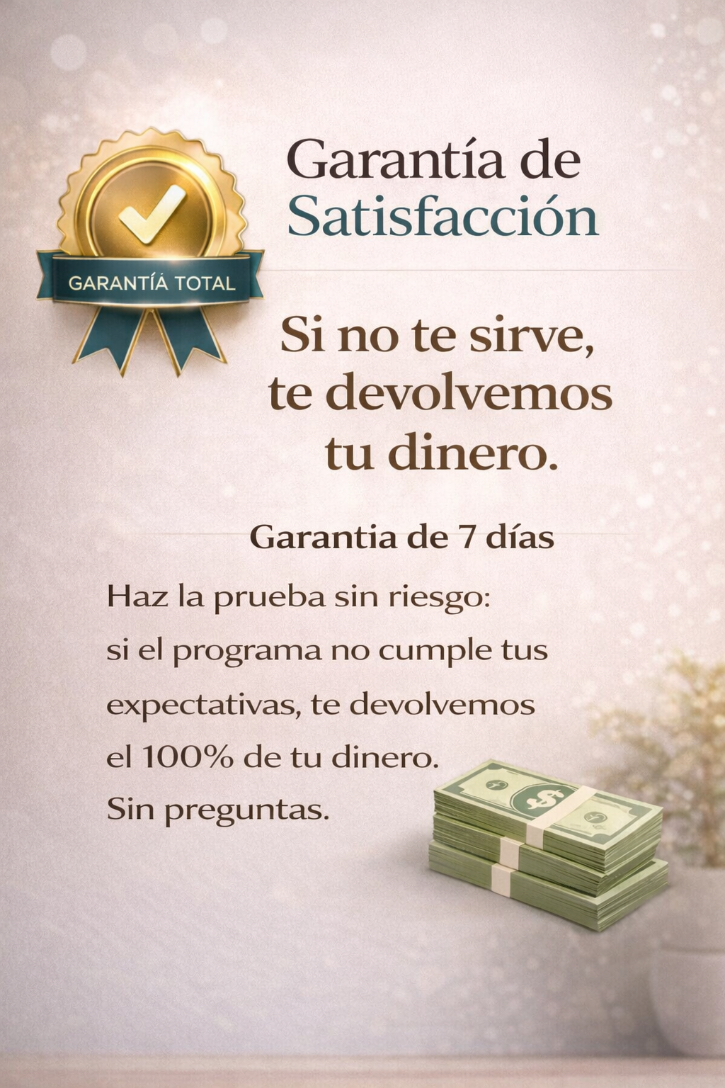 Si dentro de ese plazo sentís que el contenido no es para vos o no cumple tus expectativas, podés solicitar la devolución del 100% de tu dinero, sin preguntas ni complicaciones.