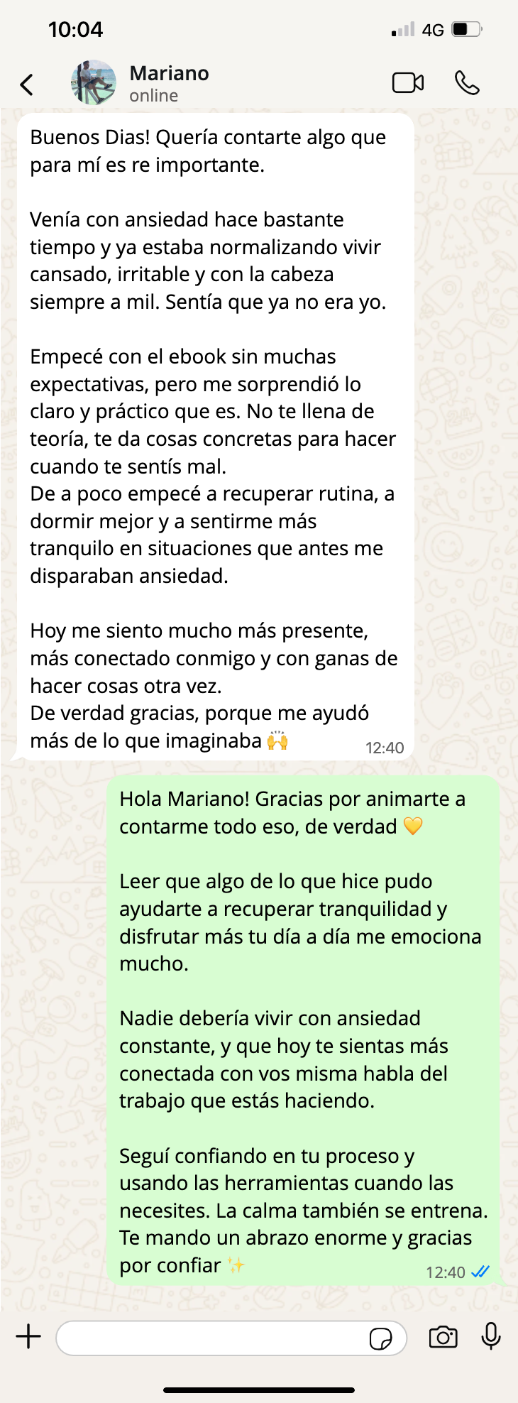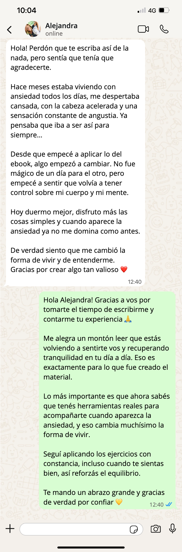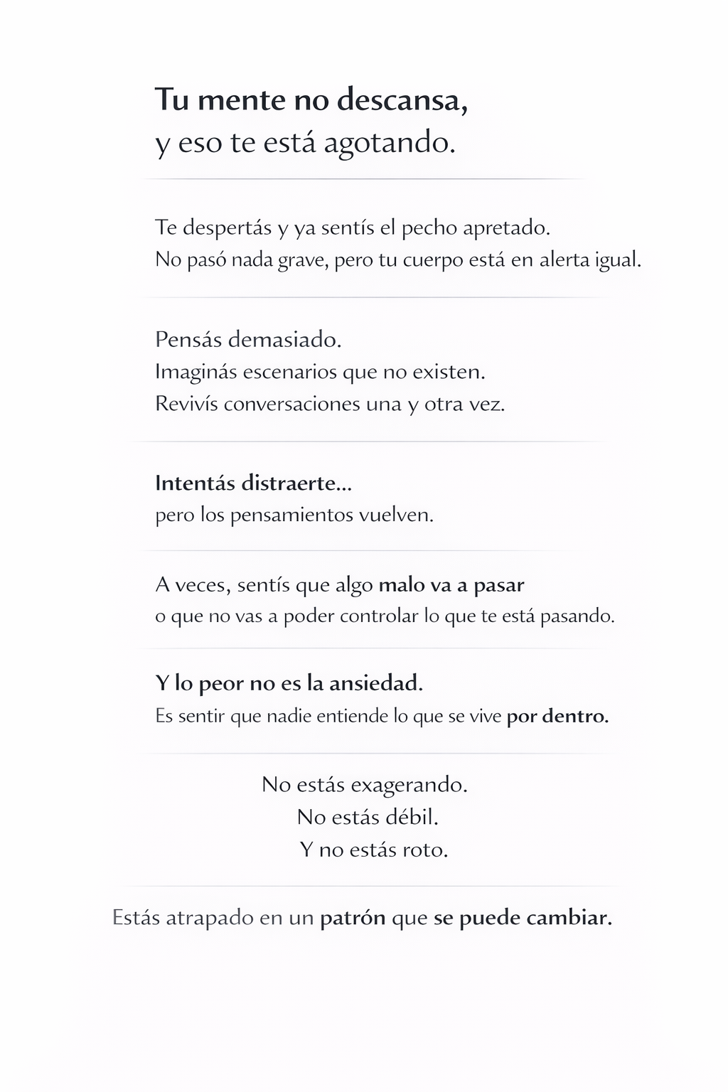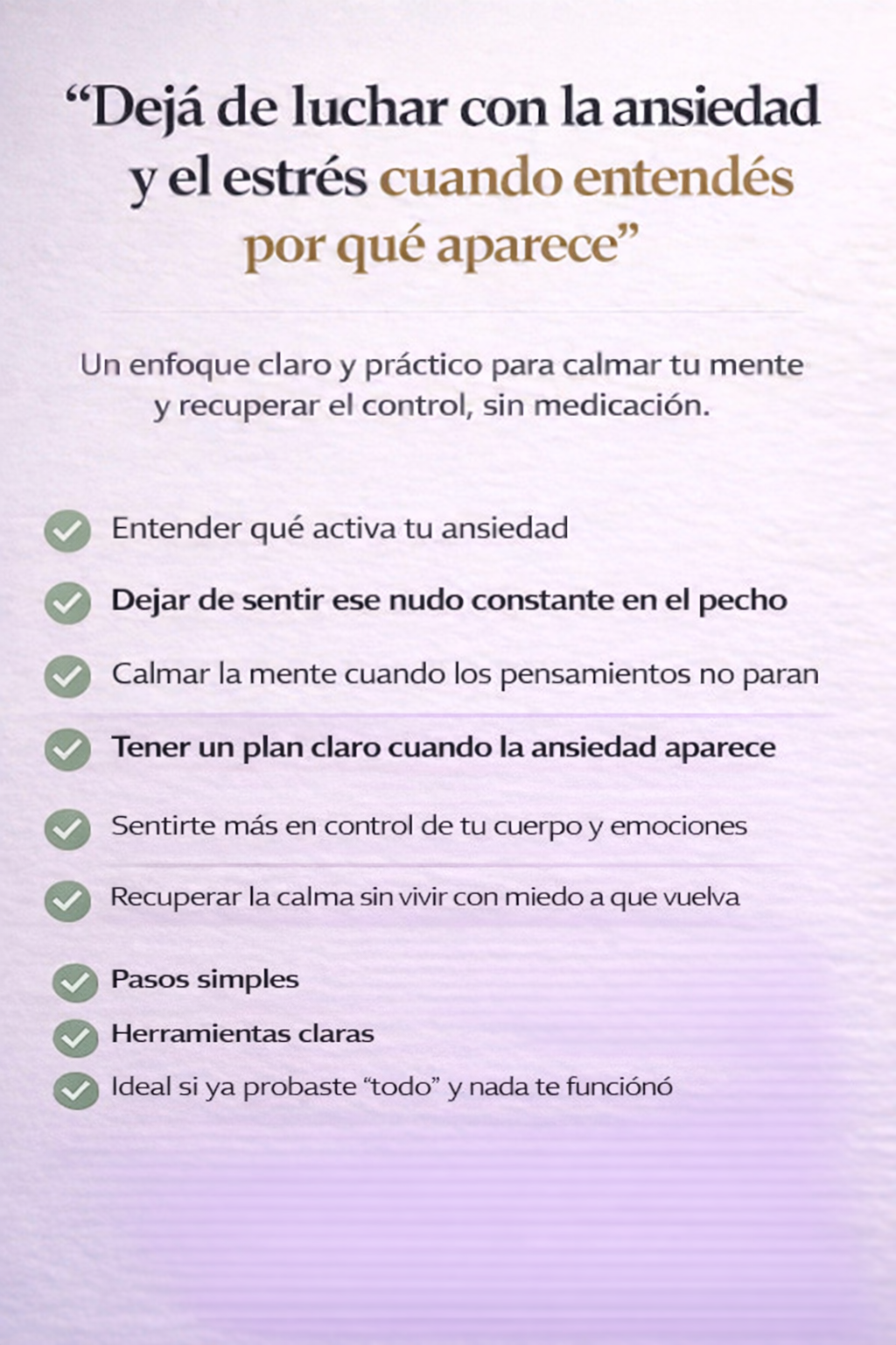 Vas a aprender a entender qué te genera ansiedad, cómo manejarla cuando aparece y qué hacer en momentos reales de crisis, con herramientas prácticas y simples.