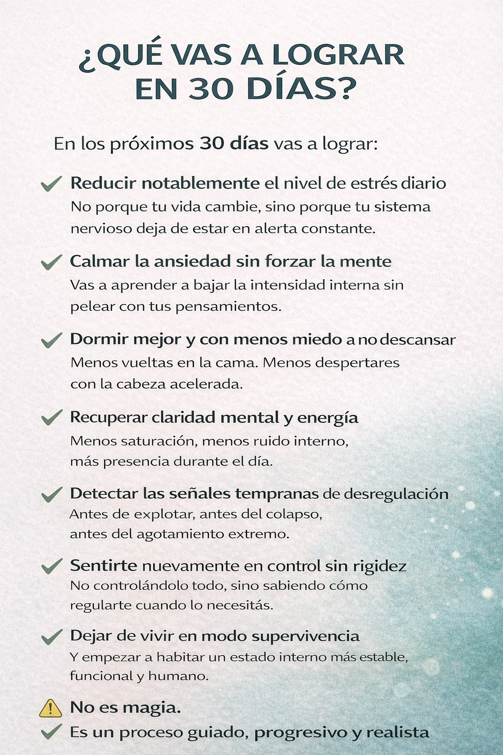 Sí, si sentís ansiedad, estrés mental, agotamiento emocional o te cuesta desconectar y calmar tu mente en el día a día. No necesitás conocimientos previos.
